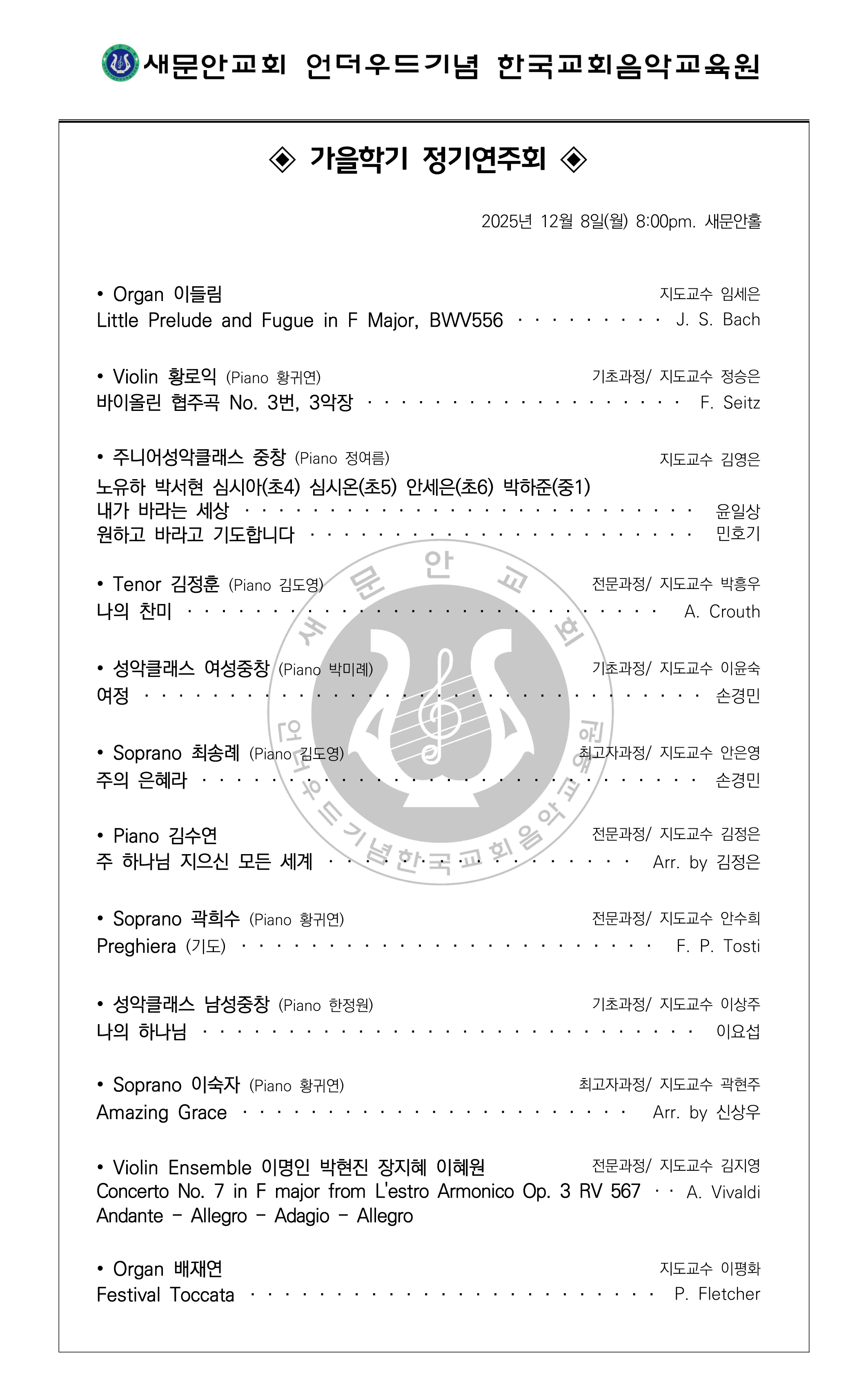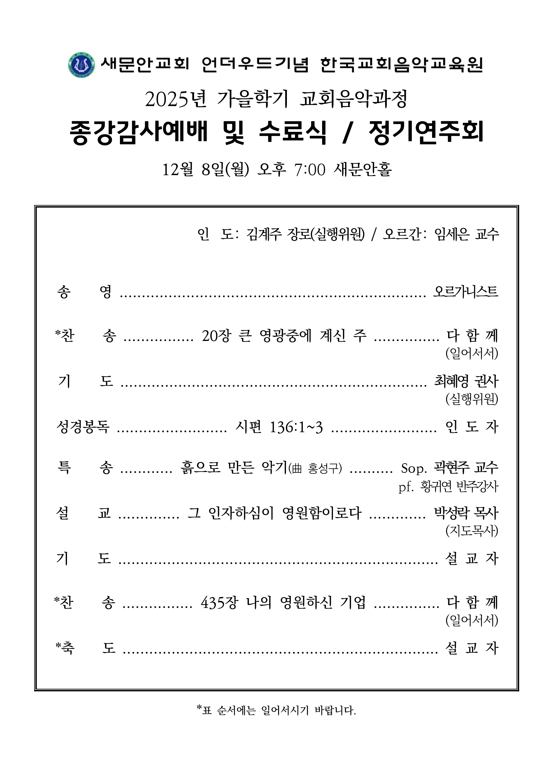 2025년 가을학기 교회음악과정 종강감사예배 및 수료식, 정기연주회