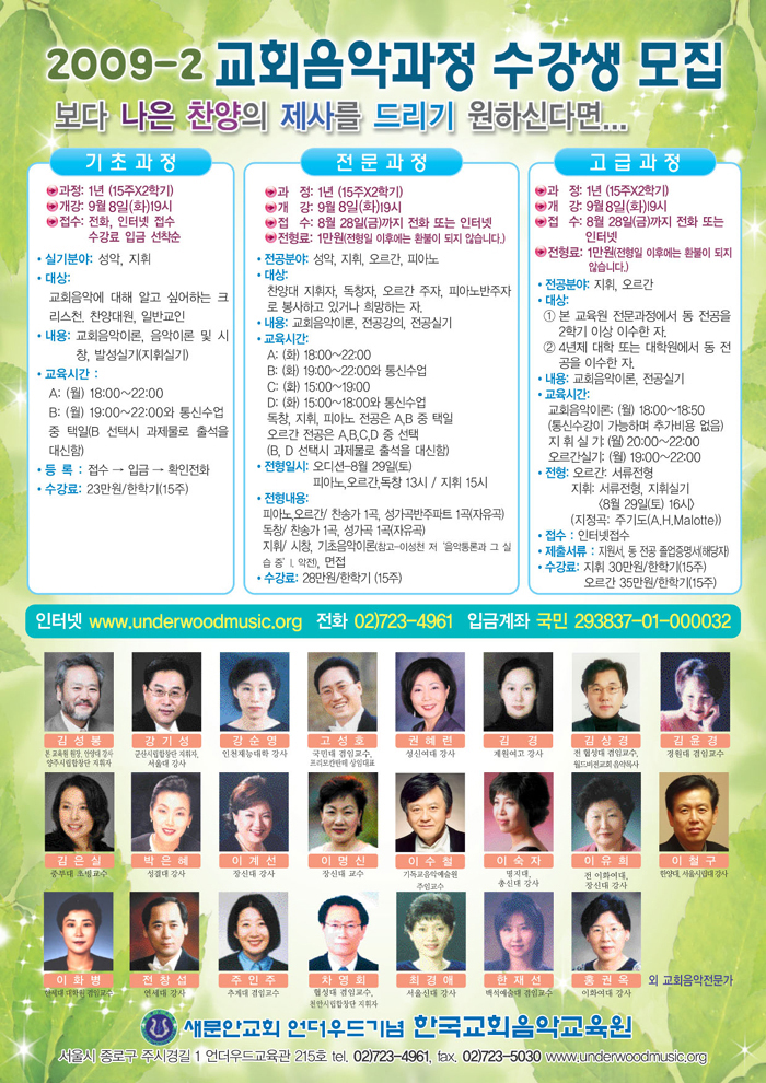 09-2 교회음악과정 수강생 모집개강일이 월요일에서 화요일로 변경되었습니다. 수강신청하러 가기->